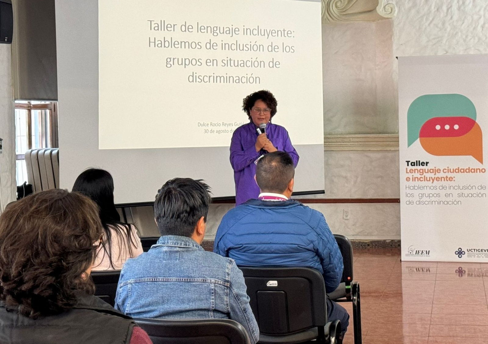 Con la finalidad de eliminar todas las formas de discriminación y refrendar su compromiso con la igualdad, el Instituto Electoral del Estado de México (IEEM) llevó a cabo el Taller de lenguaje ciudadano e incluyente “Hablemos de inclusión de los grupos en situación de discriminación”, dirigido a funcionarias y funcionarios electorales, y que fue impartido por la integrante de la Red Nacional de Académicas Feministas y del Círculo Feminista Alaíde Foppa, Dulce Rocío Reyes Gutiérrez.