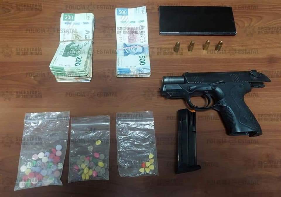Los tripulantes se identificaron como Miguel “N” de 28 años de edad y Carlos “N” de 50 años, a quienes les decomisaron un arma de fuego, calibre 9 milímetros, un cargador y varios cartuchos útiles, así como tres bolsas de plástico que en su interior contenían varias pastillas de colores de aparentes sustancias psicoactivas, un teléfono celular, color negro y un estimado de 50 mil pesos en billetes de diferentes denominaciones.