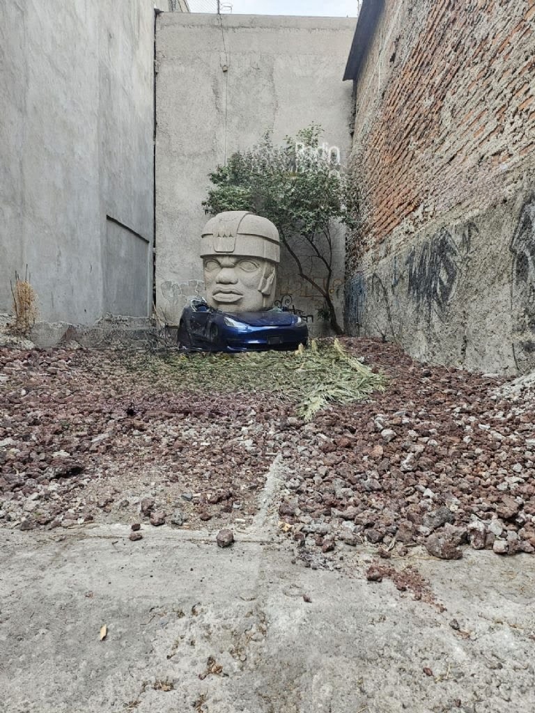 La colonia Roma, uno de los barrios más acomodados y ricos de la Ciudad de México, no deja de sorprendernos… pues ahora apareció un ¡Tesla aplastado por una cabeza Olmeca!