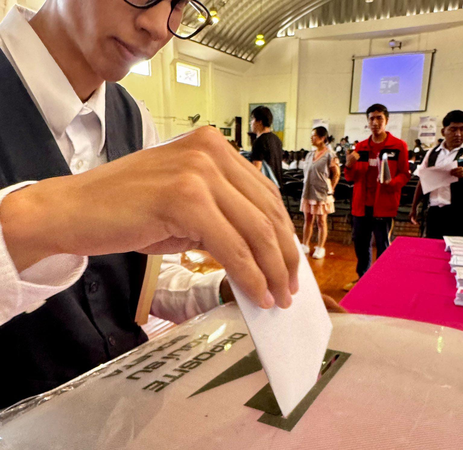 Además, realizó un ejercicio de votación utilizando boletas muestra, así como mamparas y urnas, simulando una casilla, para que las y los jóvenes conozcan de forma directa cómo emitirán su voto.
