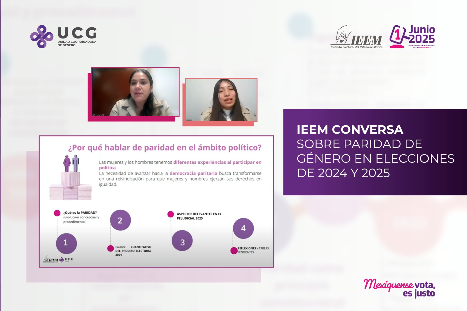 El Instituto Electoral del Estado de México (IEEM), a través de la Unidad Coordinadora de Género (UCG), impartió la charla El camino de la Paridad. Resultados en el Proceso Electoral 2024 y aspectos relevantes en el Proceso Electoral Judicial Extraordinario 2025 con el objetivo de explicar la implementación del Principio de Paridad en diferentes procesos electorales.