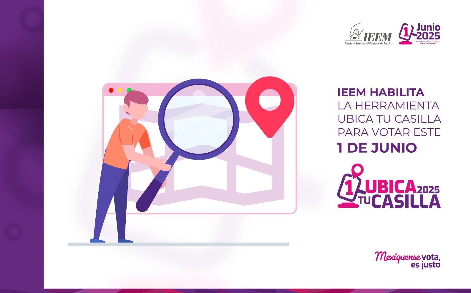 El Instituto Electoral del Estado de México (IEEM) ha puesto a disposición de la ciudadanía la herramienta digital Ubica tu Casilla, en la que, las y los mexiquenses tendrán la oportunidad de conocer el lugar exacto donde emitirán su voto el 1 de junio, para elegir a integrantes del Poder Judicial Local.