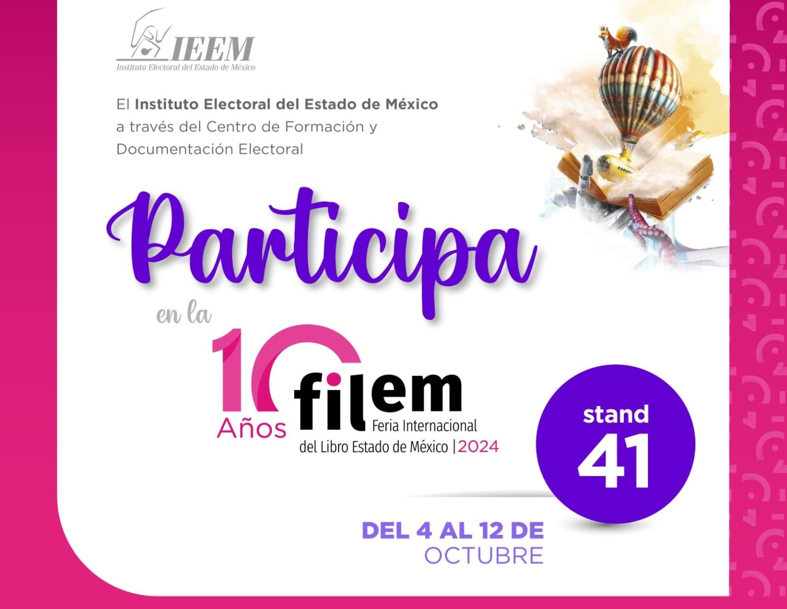 Del 4 al 12 de octubre, el Instituto Electoral del Estado de México (IEEM) participará con un estand interactivo, en la décima edición de la Feria Internacional del Libro del Estado de México 2024 (Filem), con el objetivo de promover la cultura político-electoral entre la ciudadanía.