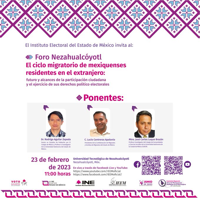 Como parte de las actividades para promover el Voto Mexiquense en el Extranjero, el Instituto Electoral del Estado de México (IEEM) realizará este 23 de febrero el Foro Nezahualcóyotl: El ciclo migratorio de mexiquenses residentes en el extranjero: Futuro y alcances de la participación ciudadana y el ejercicio de sus derechos político electorales, en las instalaciones de la Universidad Tecnológica de Nezahualcóyotl (UTN).