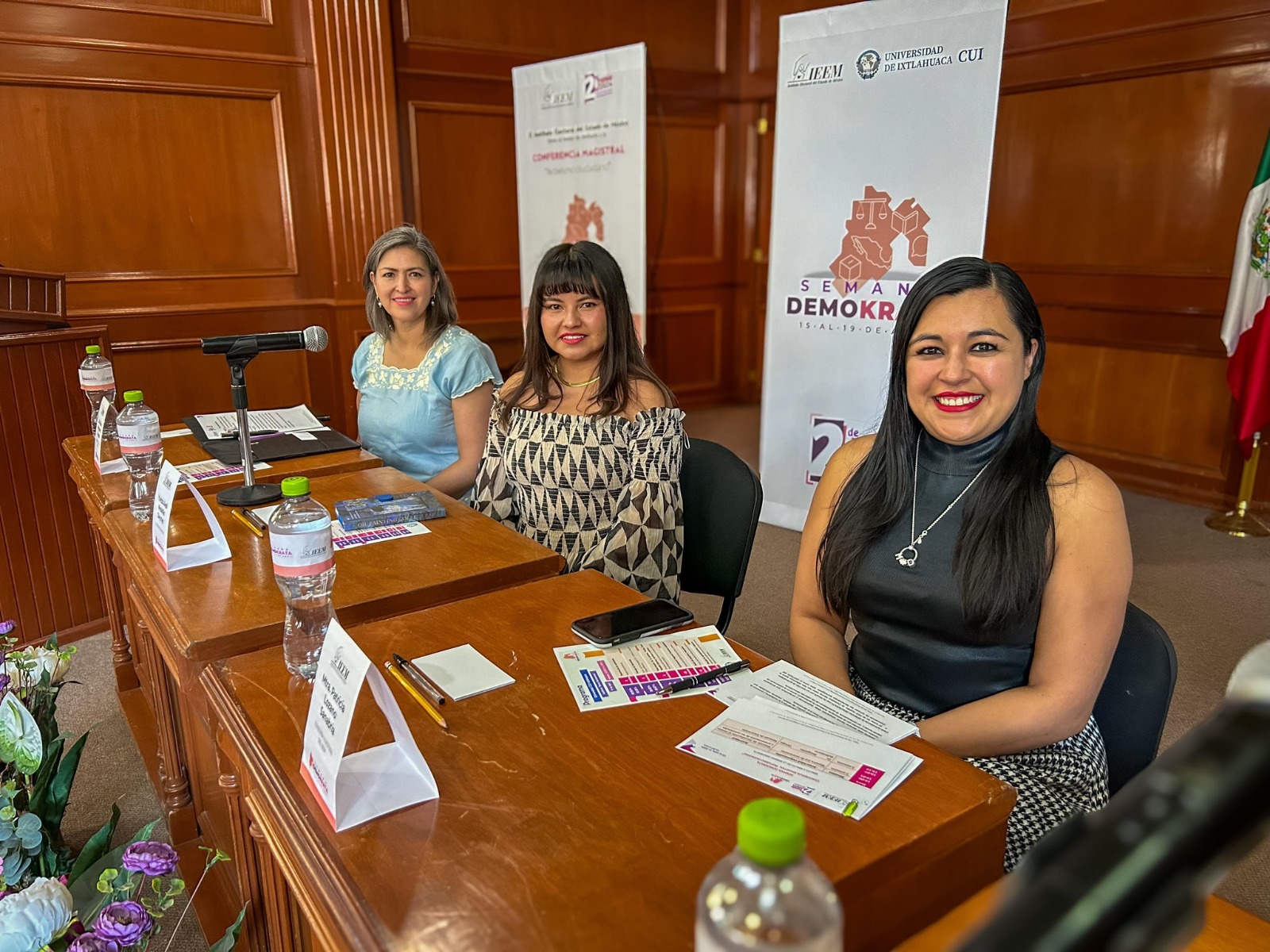 En la conferencia estuvieron presentes la Consejera Electoral del IEEM, Karina Ivonne Vaquera Montoya, así como la Directora de Participación Ciudadana del IEEM, Liliana Martínez Garnica.