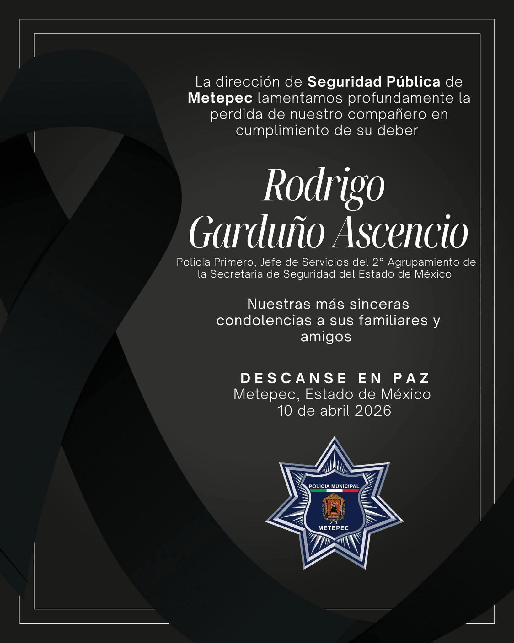 Autoridades del Estado de México confirmaron el fallecimiento del Comandante Rodrigo Garduño Ascencio, Jefe de Servicios de la Policía Estatal, tras un enfrentamiento armado registrado sobre la avenida Morelos, en la comunidad de Santiaguito Cuaxustenco, municipio de Tenango del Valle.