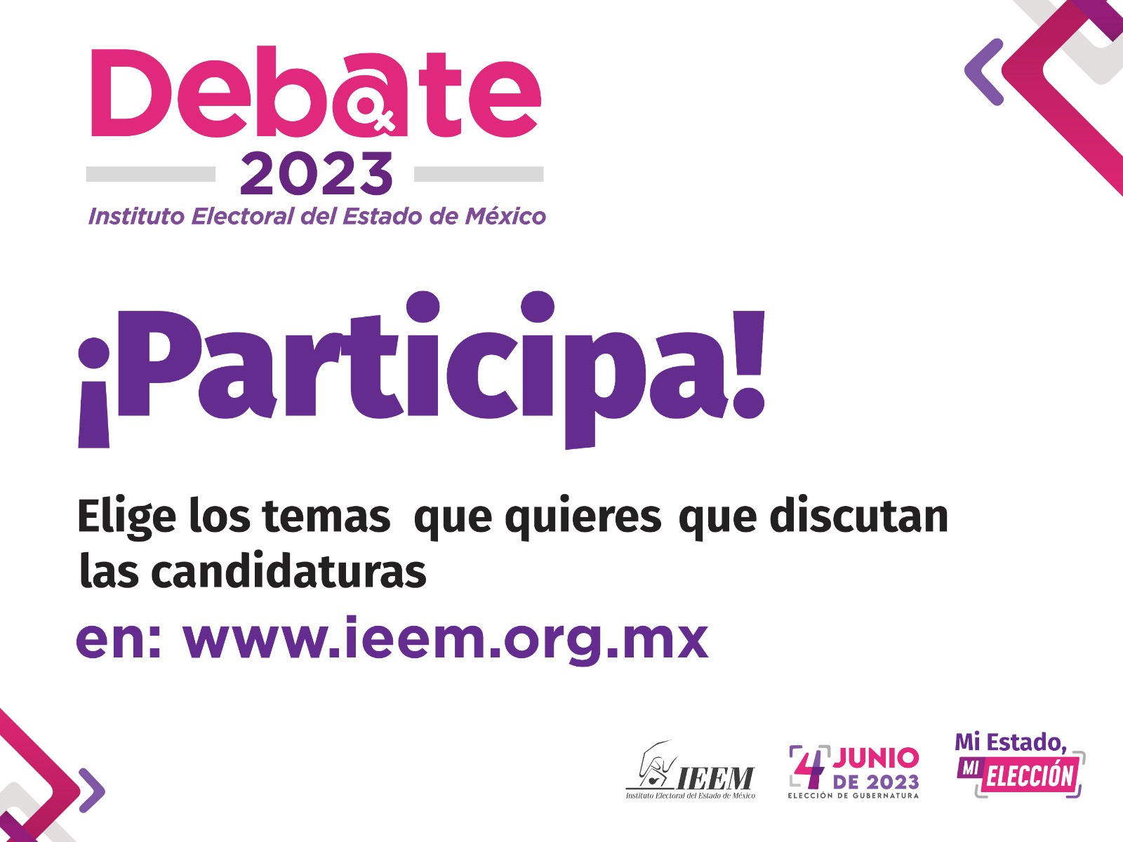 Por lo que, con el objetivo de promover el interés de las y los mexiquenses en los Debates Públicos entre Candidaturas a la Elección de Gubernatura 2023, el Instituto Electoral del Estado de México (IEEM), como parte de la primera etapa de este ejercicio de participación ciudadana, creó el micrositio https://sistemaselec.ieem.org.mx/debates-publicos/, en donde a través de una encuesta, será posible elegir hasta cuatro temas a abordar durante dichos encuentros.