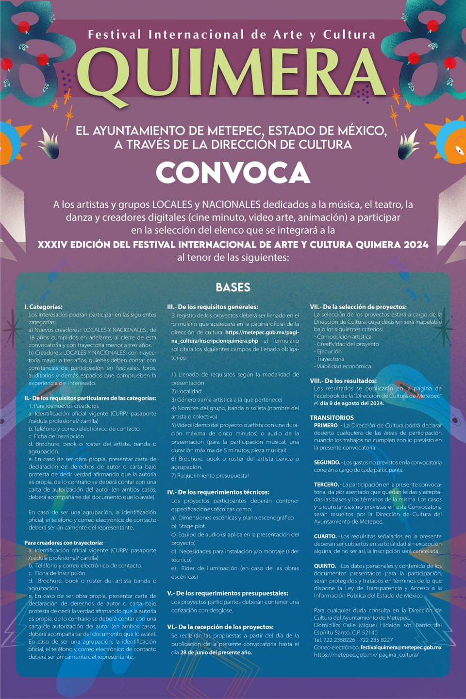 La Dirección de Cultura de Metepec, publicó la Convocatoria para los artistas y grupos locales y nacionales, dedicados a la música, el teatro, danza y creadores digitales (cine minuto, video arte y animación) a participar en la selección del elenco que se integrará en la XXXIV edición del Festival Internacional de Arte y Cultura Quimera 2024.