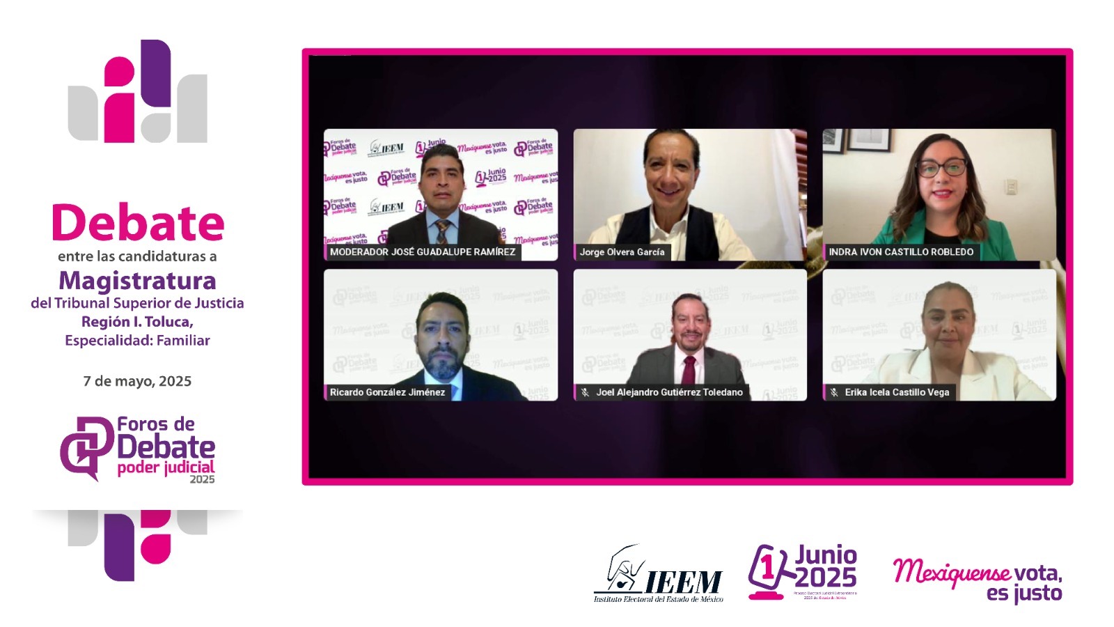 Como parte del Proceso Electoral Judicial Extraordinario 2025, este 7 de mayo, el Instituto Electoral del Estado de México (IEEM) llevó a cabo, de manera virtual, tres Foros de Debate entre las candidaturas a Magistraturas del Tribunal Superior de Justicia de la entidad, dos de la Región I Toluca y uno de la Región II Tlalnepantla, las tres en materia familiar.