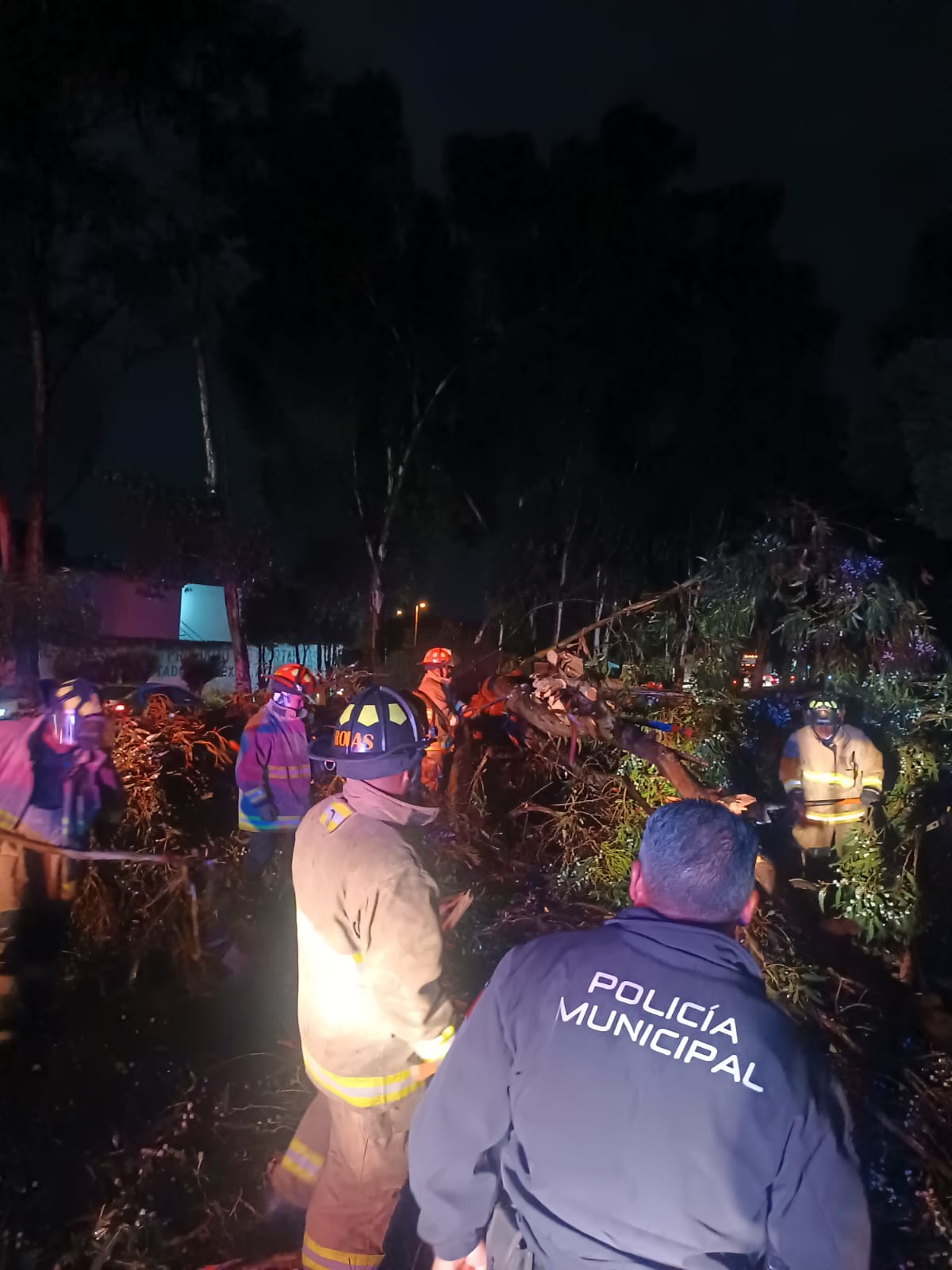 Luego de la fuerte lluvia registrada la noche de este martes en el Valle de Toluca, un árbol cayó encima de un vehículo Seat color rojo, con placas de circulación NMAK6254.
